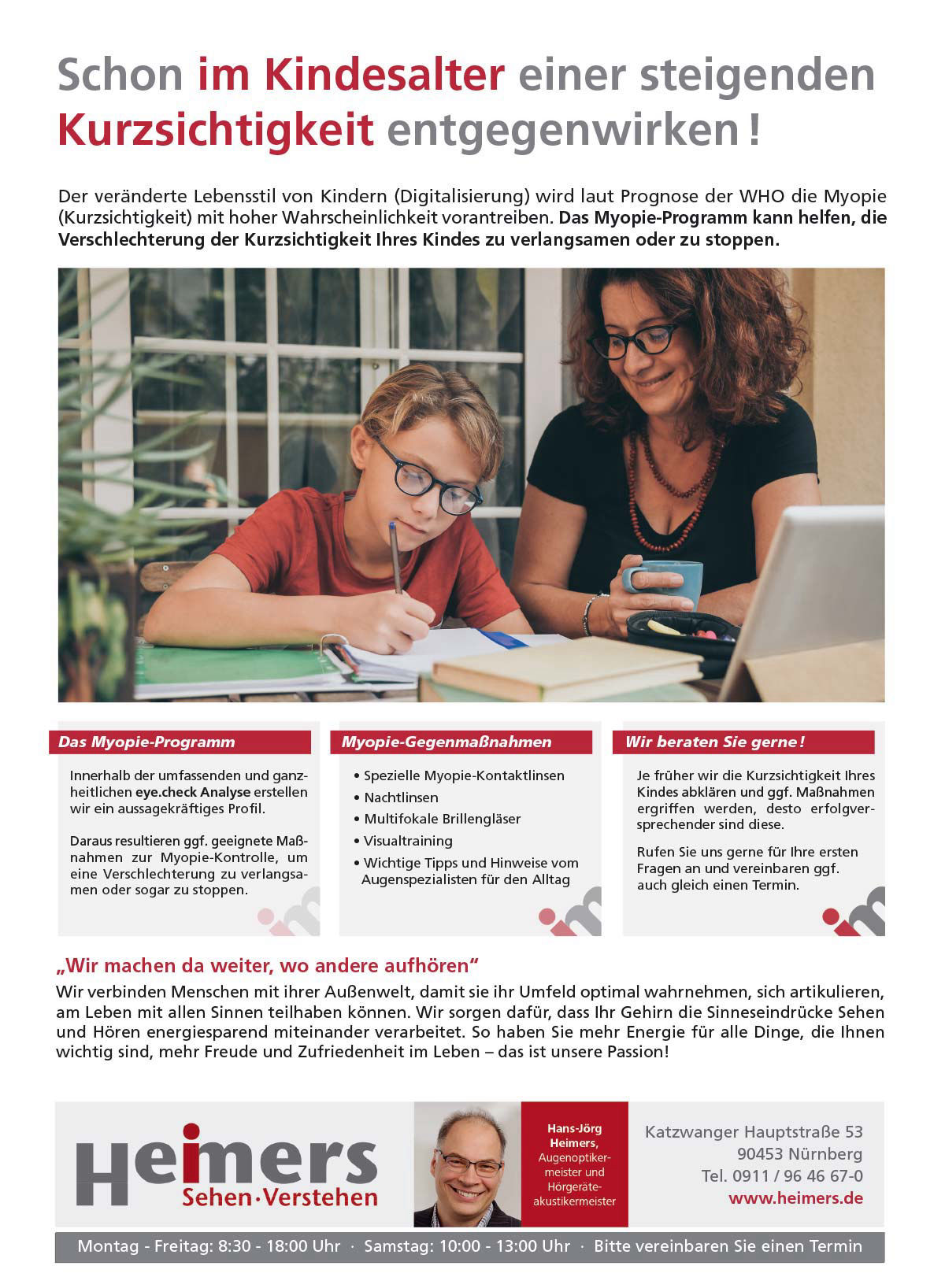Ihr Augenoptiker und Hörgeräteakustiker Heimers in Nürnberg. Wir machen da weiter, wo andere längst aufhören und Sie werden erstaunt erkennen: Sehen ist nicht gleich Sehen und Hören ist nicht gleich Verstehen. Perfekt angepasste Brillen, Kontaktlinsen und Hörsysteme helfen dabei, die Leistungskraft Ihrer Sinne zu erhalten und sie gleichzeitig ohne Ermüdungserscheinungen zu fordern. Übrigens: Als von Zeiss zertifiziertes Relaxed Vision ® Center passen wir mithilfe neuester optometrischer Technologien die Brille individuell und optimal Ihren Augen an. Unsere Leistungen Fernbrille, Nahbrille, Gleitsichtbrille, Arbeitsplatzbrille, Raumbrille, Nachtbrille und DriveSafe-Gläser, Sonnenbrille, Gläser für die digitale Welt, ZEISS Brillengläser mit i.Scription® Technologie, Kontaktlinsen, Hörgerät, Hörsystem, Gehörschutz, Ohrhörer, PSA, In-Ear-Monitoring, Augenprüfung, Hörtraining, Höranalyse, Reparatur und Reinigung. Heimers, Ihr Augenoptiker und Hörgeräteakustiker, betreut Kunden aus Nürnberg, Katzwang, Reichelsdorf, Eibach und Schwabach.